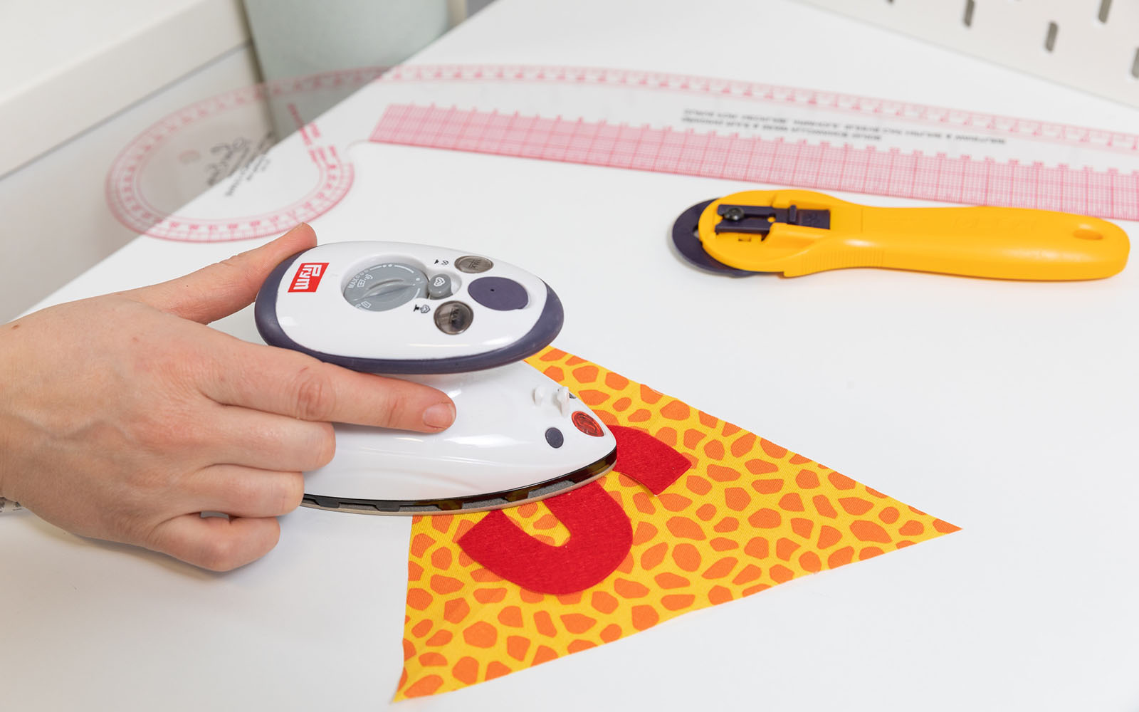 Lege einen Buchstaben pro Dreieck mit der Applikationsseite nach unten auf die rechte Seite des Dreiecks und bügele ihn fest.