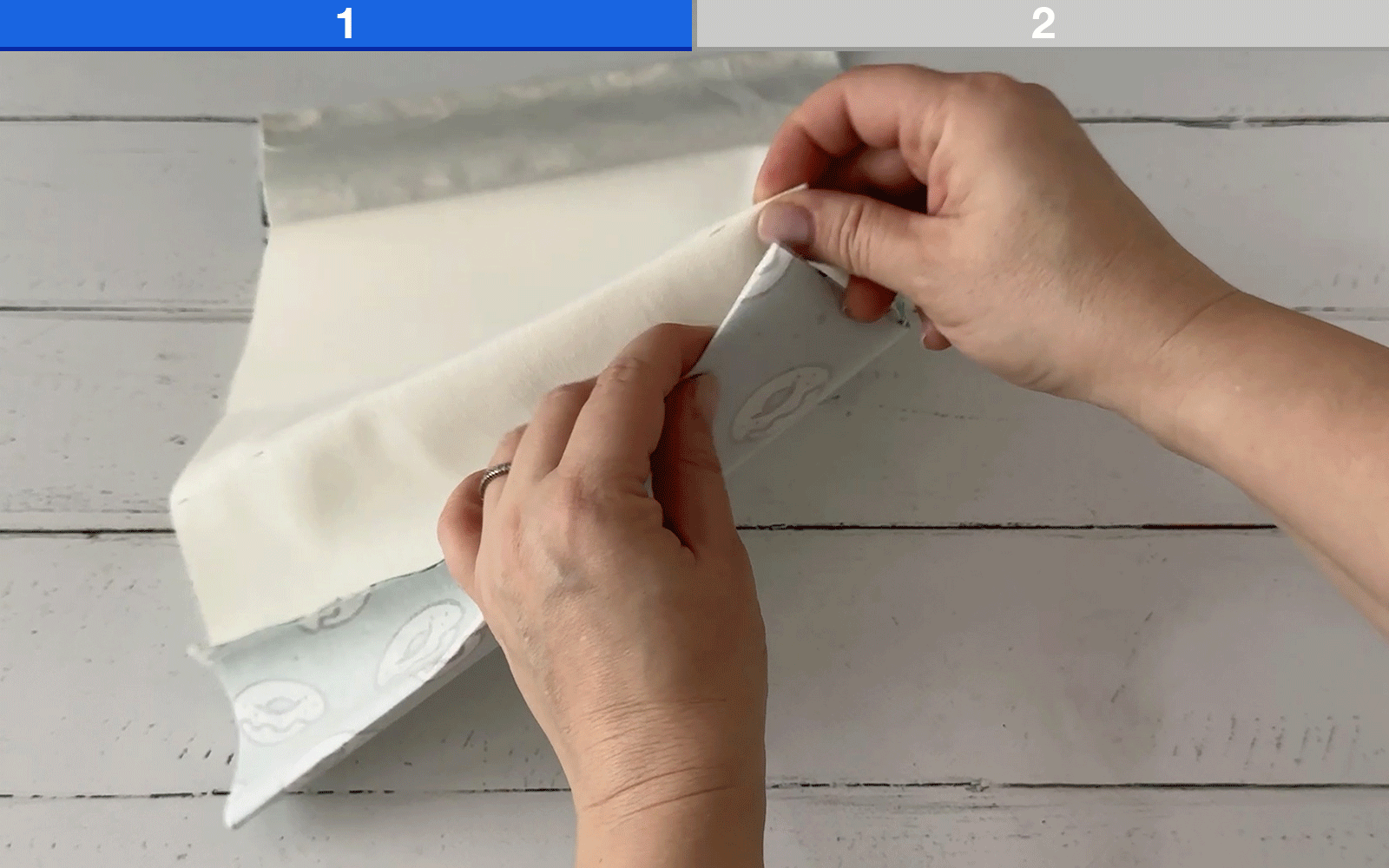 Bügle die Nähte mit den Fingern. Beginne mit einem Ende des Stoffes und falte das Futter an den Markierungen, sodass die rechten Seiten aufeinander zeigen. Drücke mit den Fingern darauf und mache dann dasselbe mit dem laminierten Außenstoff.