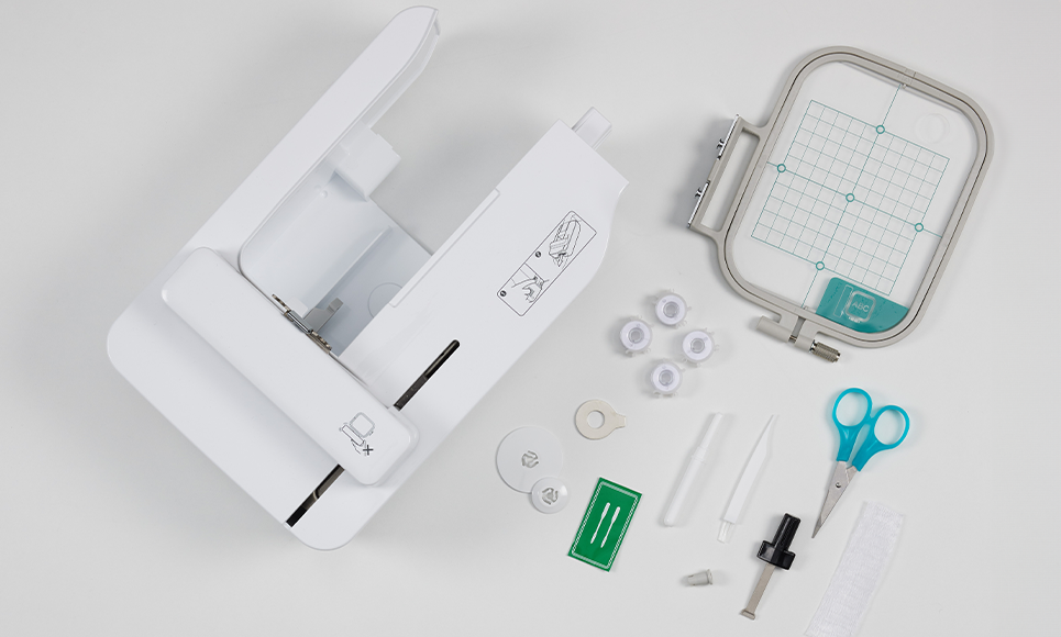 Einfach Stickeinheit und -rahmen einsetzen, Muster auswählen und Sie können mit dem Sticken loslegen. Zusätzliche Stickrahmen sind optional erhältlich.