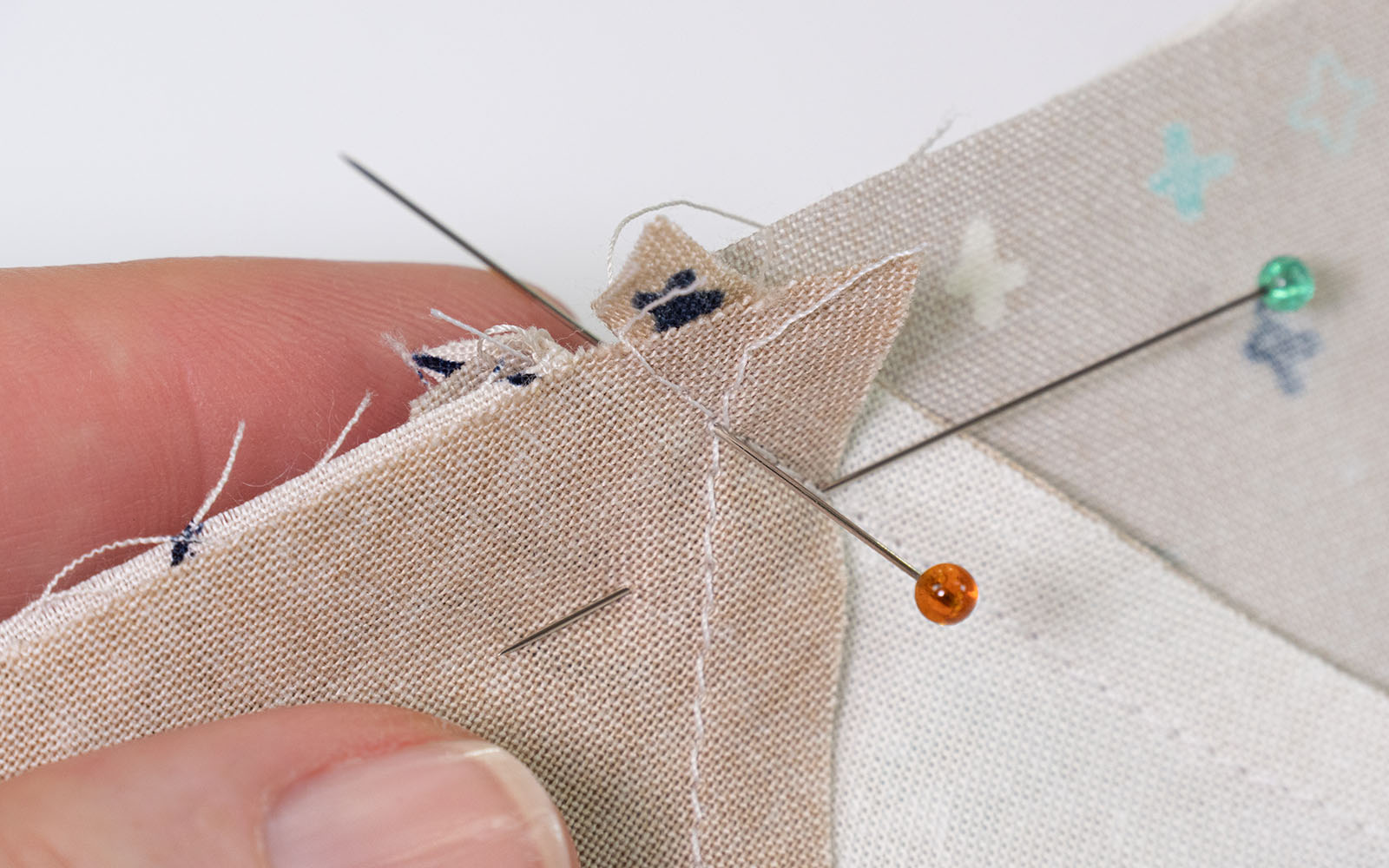 Push the fabrics together but keep the pin perpendicular with the fabric.Place pins on either side, or horizontally below the first pin. Once you have pinned securely, the first pin can be removed.