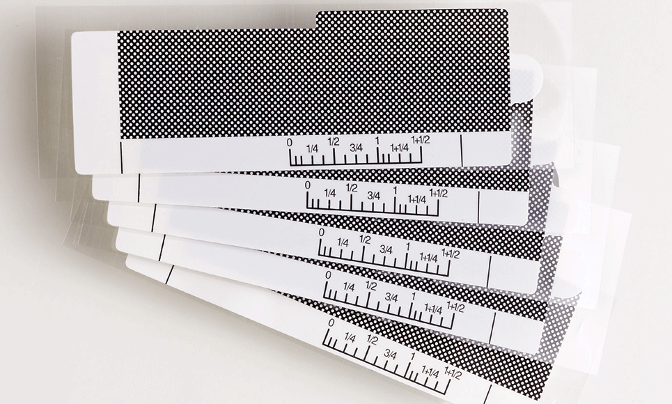 Les feuilles de couture en bordure sont utilisées en conjonction avec la technologie de pointe assistée par caméra (caméra intégrée) de l’Innov-is XV et le pied d’alignement pour couture verticale (F063) pour bien aligner les bordures droites et arrondies du tissu lors de la couture.
