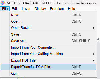 Verberg en vergrendel, in CanvasWorkspace, alle lagen behalve degenen met de titel "TOP". Verzend naar de ScanNCutmachine met de menu-optie Bestand>FCM bestand exporteren, en maak de keuze hoe het bestand moet worden overgebracht (USB-stick of Draadloos overzenden)