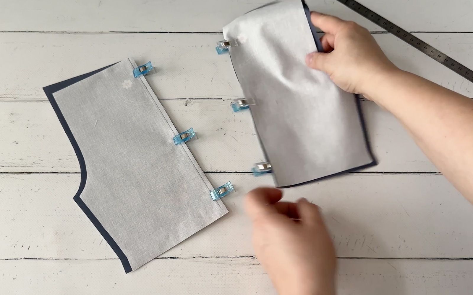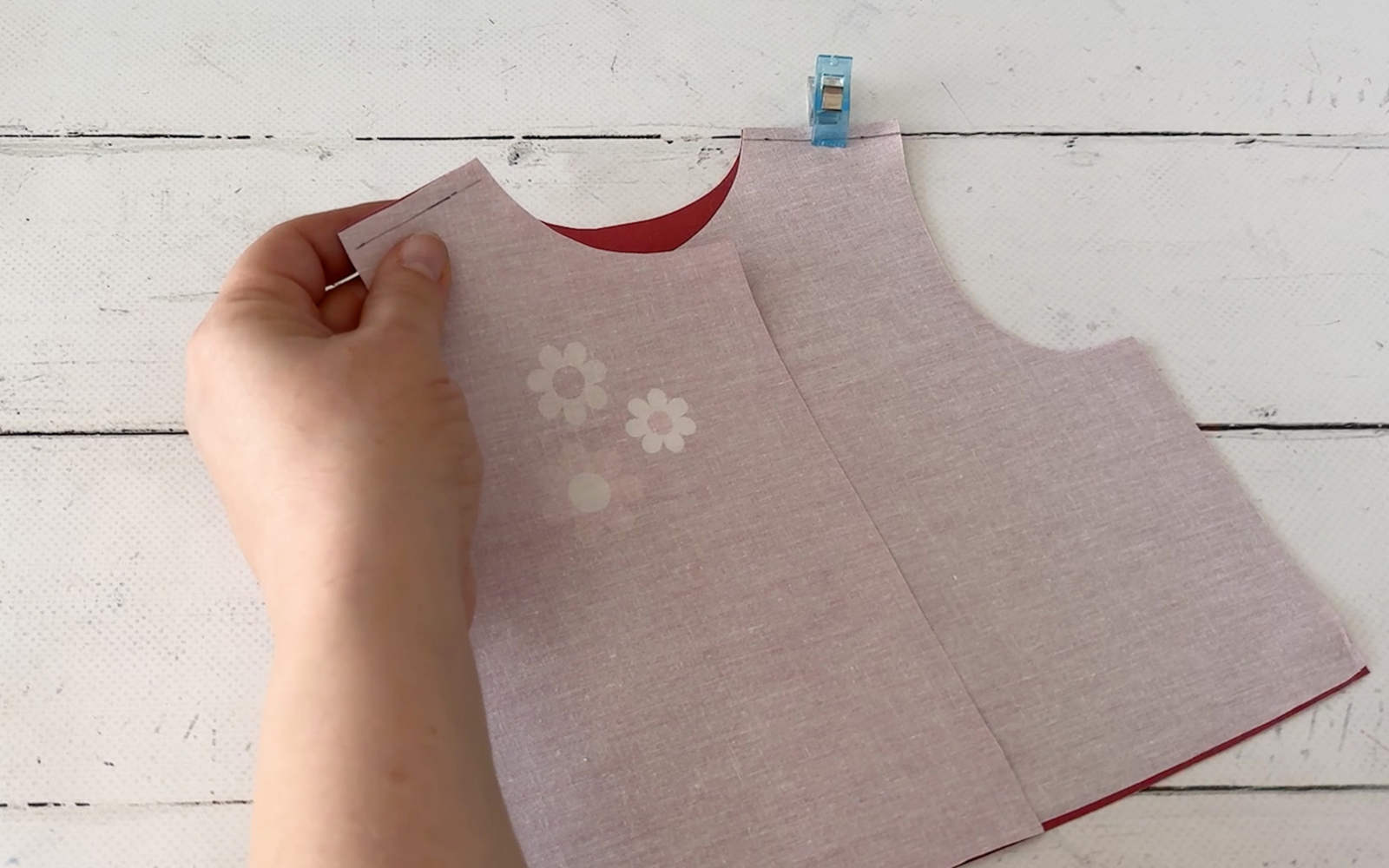 Leg de voorpanden op het achterpand, met de goede kanten op elkaar. Speld de schoudernaden (randen a en b). Naai en werk af.