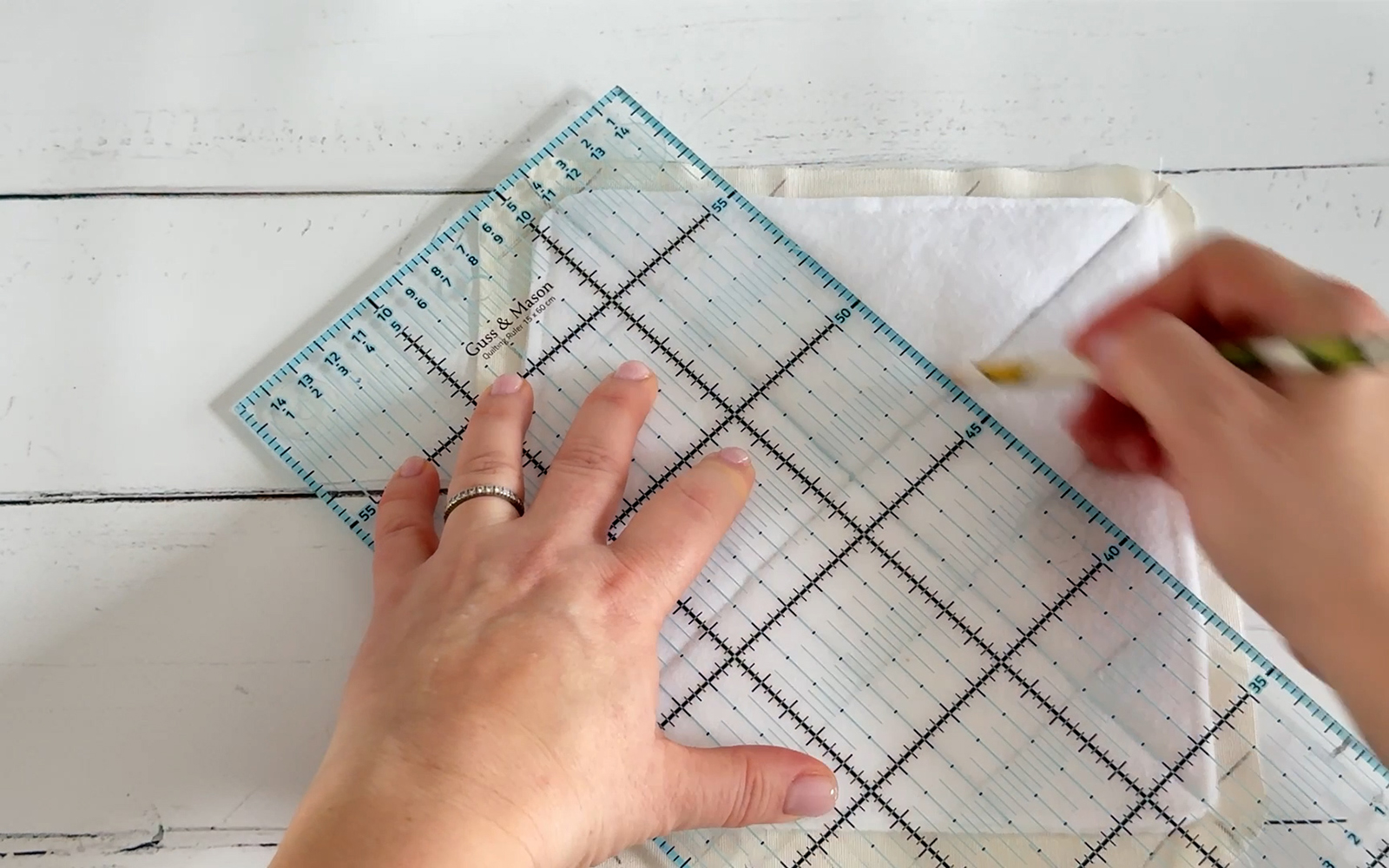 Teken aan de kant van het volumevlies twee diagonale lijnen die de hoeken verbinden en elkaar in het midden kruisen. Naai vast langs deze lijnen.